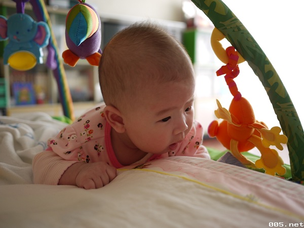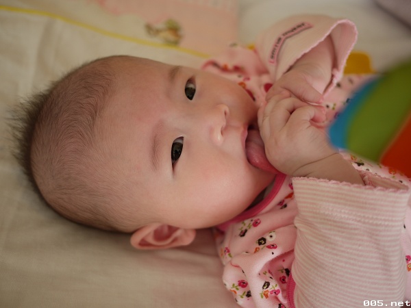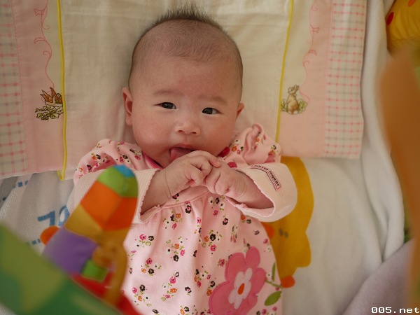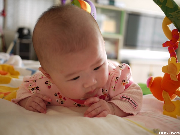 這星期在台北時,就在電話中聽媽說我們小荳仔越來越喜歡舔手手了,而且也可以左手右手相碰,所以這星期回家就想看看小荳的成長,她一天一天的長大,給我們的surprise也就越來越多,今天我逗著她ㄇㄟ~ㄇㄟ,她也笑開了,一直呵呵笑,這個小傢伙還真是個愛笑的小baby。另外jessy今天也訓練她趴著,之前將她翻身她總是會哭,這星期好的多,而且頭也能抬起來了,現在看著她,總是有股很幸福的感覺在心裡。