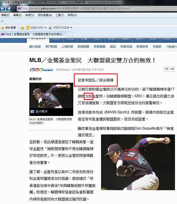 雖然照片中的投手也姓”金”,不過是曾在響尾蛇隊投過的下鉤球投手”金炳賢”,這只要前幾年看過MLB的都知道吧,就算不清楚好了,至少連左右手也要分清楚阿,不是隨便拿張照片就了事的。