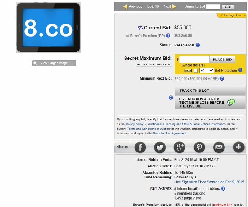即便是部分人解釋為com的typo,但從一開始的部分.co高價成交,到現在好像又有點無聲無息,偶而有些交易出現,反倒是.com因為中國投資客的喜好,愈來愈顯得.com is the king,百萬人民幣成交已經顯得十分普通的價格,不過個人與張無影版友都持同樣的看法,如果有機會以不錯的價格取得8.co,仍是還有不錯的程度獲利。