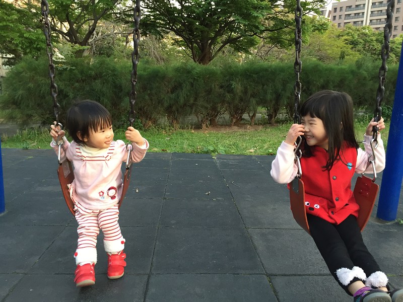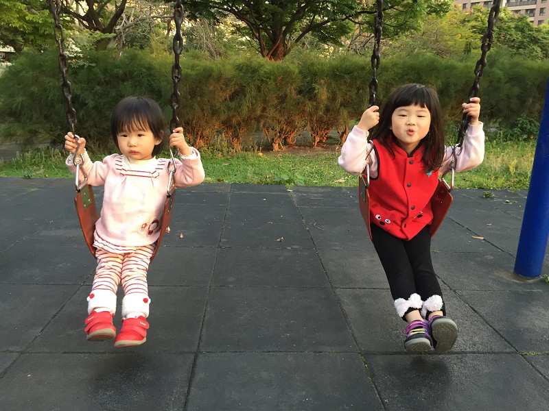 趁著假日帶小傢伙們出門逛逛,就在台中外公外婆家附近的公園,兩個一到公園就整個大爆走,但還好還不到不受控制,玩玩溜滑梯後玩搖搖馬,最後看到盪鞦韆也想玩,抱著小小妹讓她坐在鞦韆上,很意外的是兩姊妹乖乖坐好來讓我拍照。